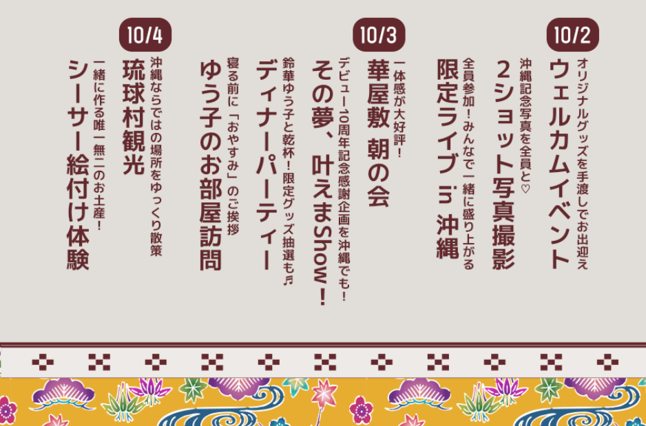 さらに今回はファンクラブ内で実施している「10周年記念10ヵ月連続感謝企画」の〝その夢、叶えまSHOW〟を沖縄でも実施!!参加者の中から選ばれた華ファミリーだけが叶えられる、対面での叶えたい夢をぜひ実現させてください!